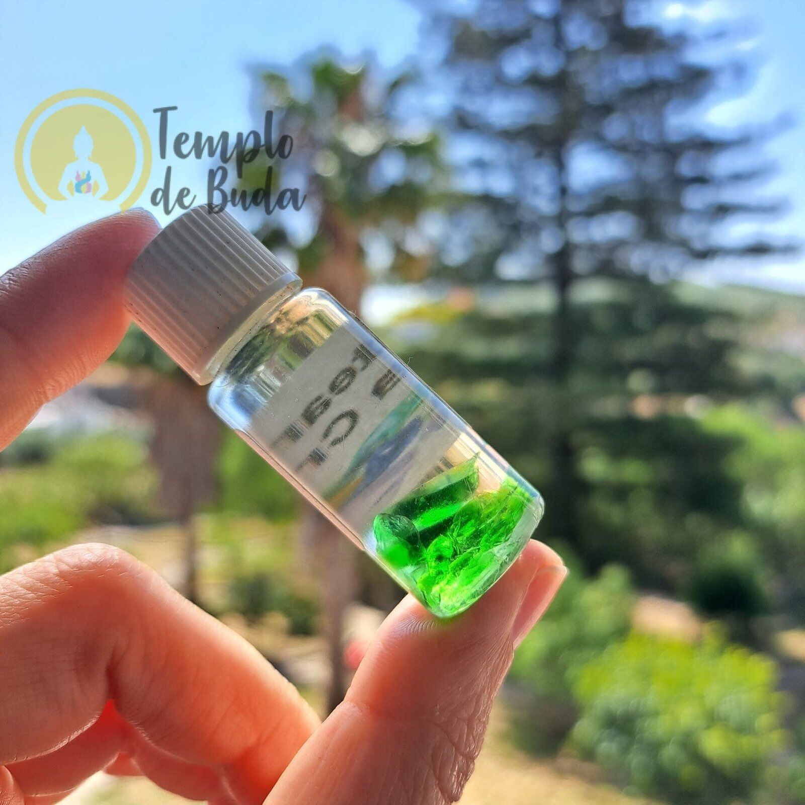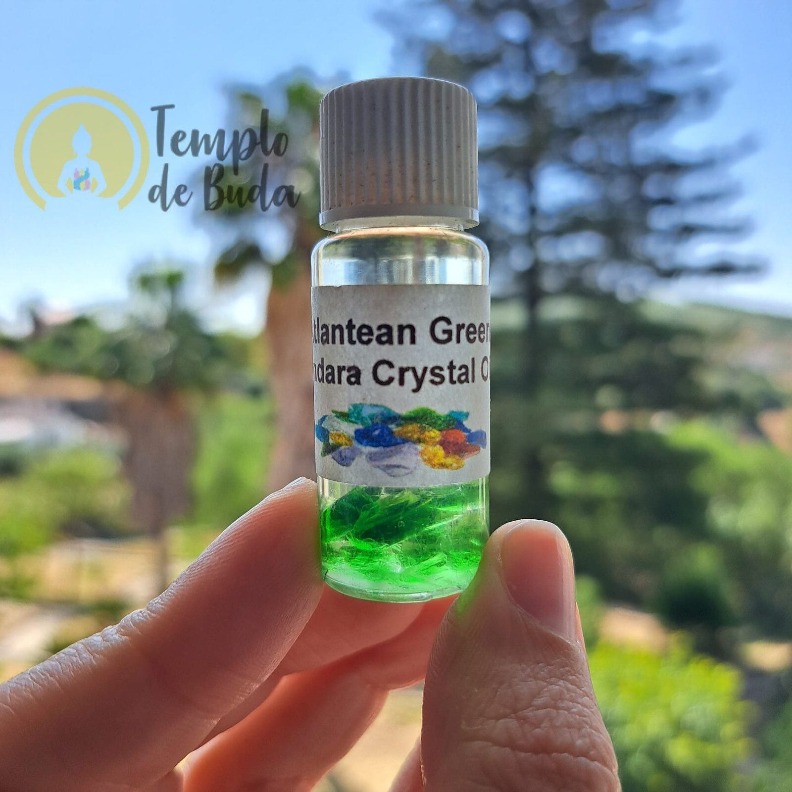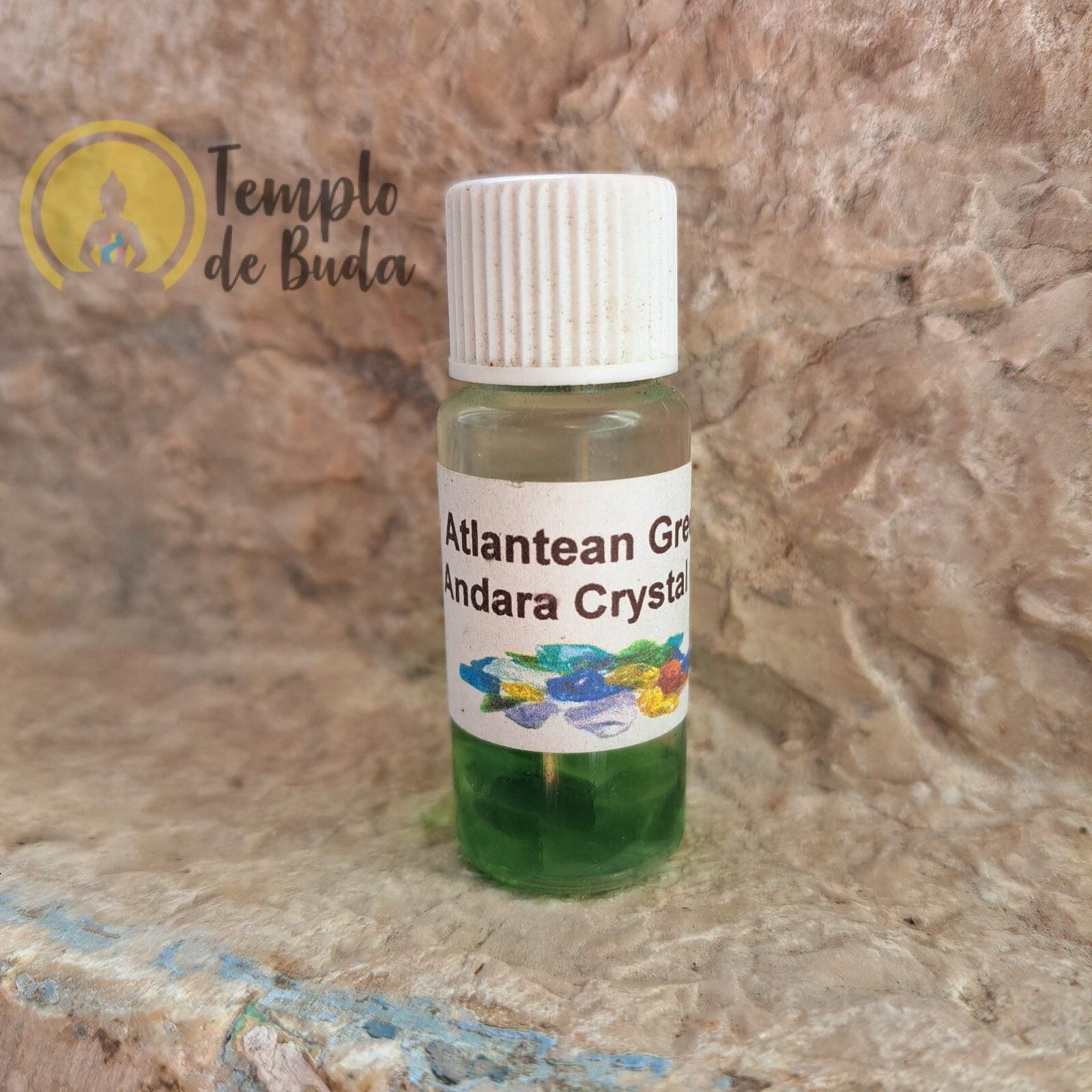 Óleo de Andara Atlantean Green, cada frasquinho contém 10 ml e chips de cristais Andara genuínos.