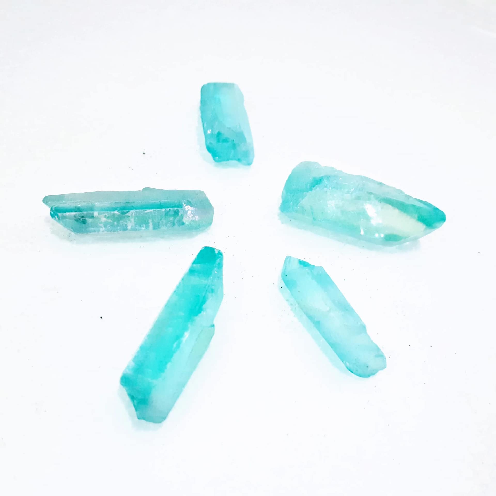 As pontas de Aqua Aura Quartzo Azul são de uma bela cor azul brilhante, mas esta cor não é natural, mas ainda assim estas lindas pedras têm uma energia muito alta e bastante intensa, que activa todos os chakras.