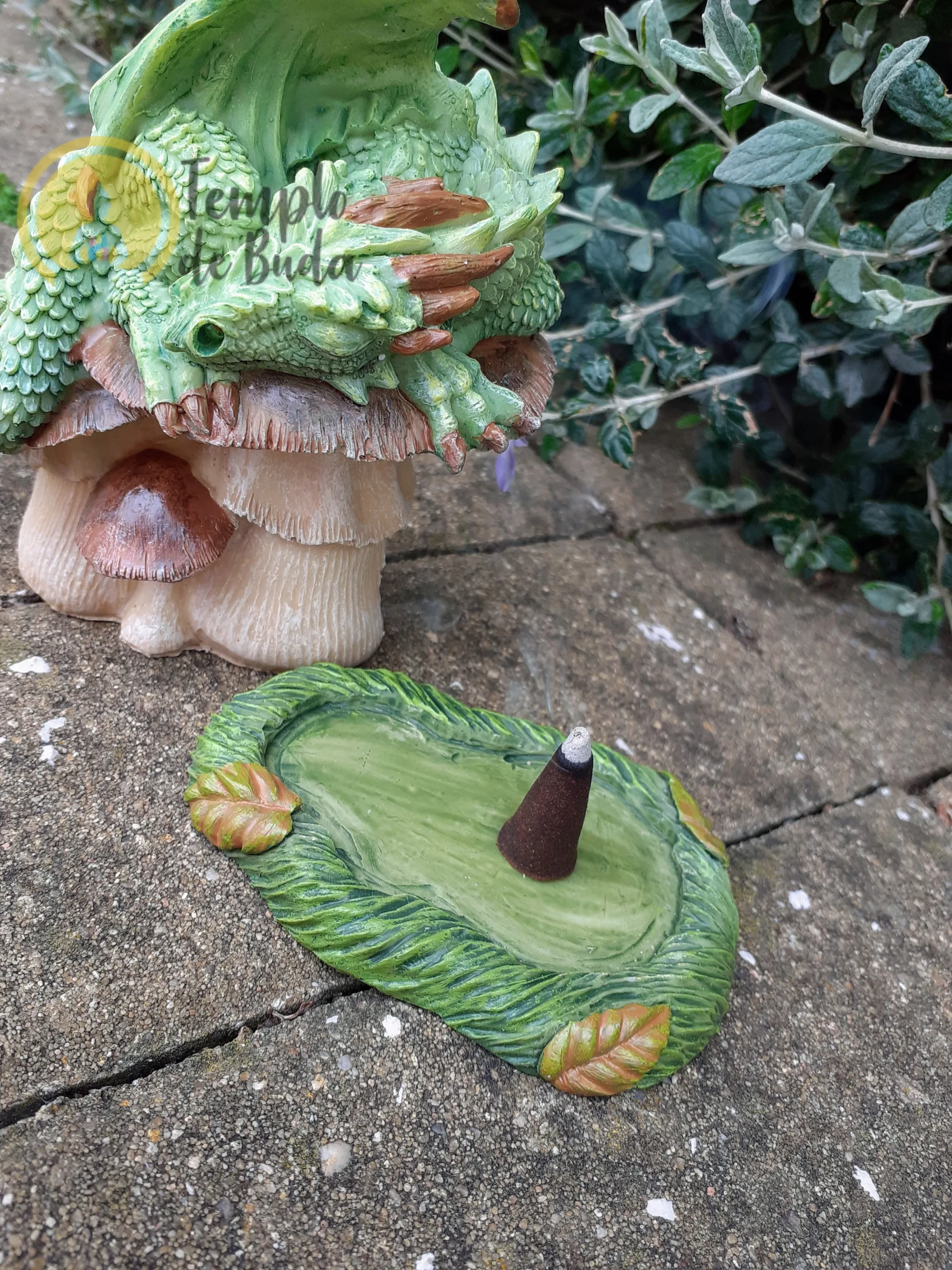Incensário Dragão Verde exclusivo e desenhado por Anne Stokes. Este atraente incensário é proprio para cones de incenso e apresenta um dragão verde a dormir em cima de um cogumelo venenoso. Quando um cone de incenso é aceso e colocado dentro do dragão, o fumo flui através da parte superior do queimador e pelas narinas do Dragão.