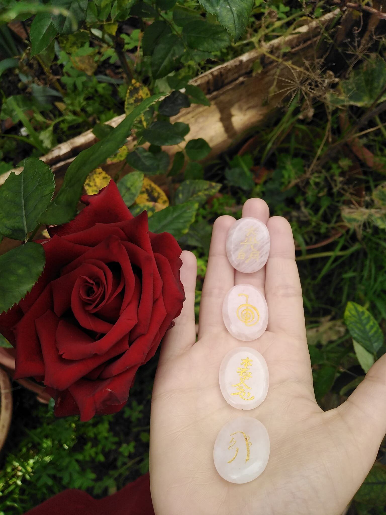 Cada plano do Kit Reiki Quartzo Rosa Redondo possui um símbolo de reiki Usui: Cho Ku Rei é usado para aumentar a intensidade da luz e cura representando a capacidade de iluminar espiritualmente; Sei Hei Ki simboliza a harmonia, a sua intenção é a purificação e é usada para a cura mental e emocional; Hon Sha Ze Sho Nen é usado para enviar reiki a longas distâncias, a sua intenção é intemporal; Dai Ko Myo, o símbolo mestre representa tudo o que é o Reiki, a sua intenção é a iluminação. O símbolo é usado pelos mestres de reiki apenas para iniciar outros na técnica de Reiki.