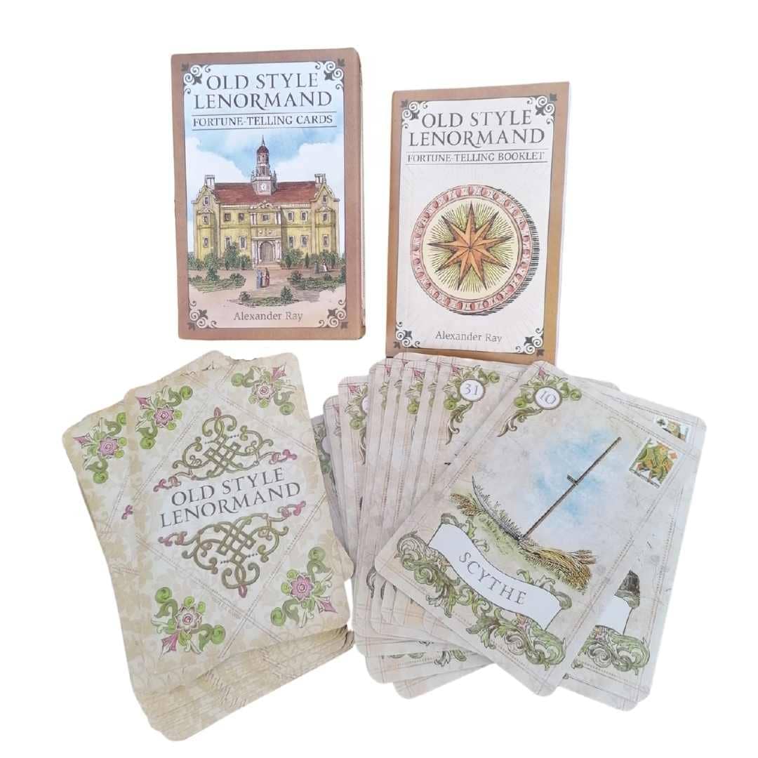 Old Style Lenormand traz ilustrações encantadoras e vintage para o público moderno de Lenormand. As imagens simples e concisas fornecem respostas altamente específicas para suas perguntas. As inserções de cartas de jogar aumentam o poder de adivinhação das cartas. O Old Style Lenormand é composto por 38 cartas (incluindo duas cartas do Cavaleiro e duas da Dama). Um livreto ilustrado de 92 páginas acompanha o baralho.