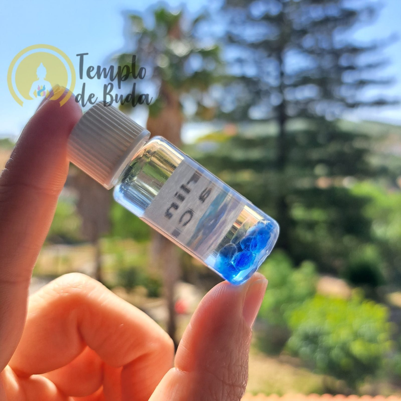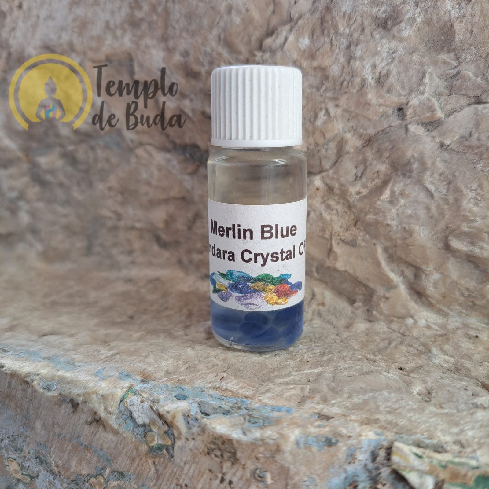 Óleo de Andara Merlin Blue, cada fraquinho contém 10 ml e chips de cristais Andara genuínos.