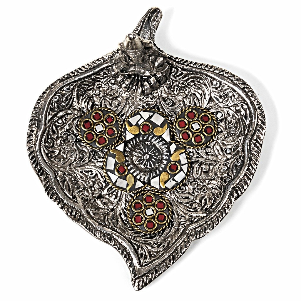 O Porta Incenso Ganesh Prateado Colorido é um objeto espiritual e decorativo em forma de folha, símbolo de crescimento, renovação e ligação à natureza. Produzido em metal com acabamento prateado, apresenta incrustação colorida em forma de mosaico, cujas cores podem variar, tornando cada peça única. A presença de Ganesha confere proteção, sabedoria e remoção de obstáculos, elevando a vibração do espaço.