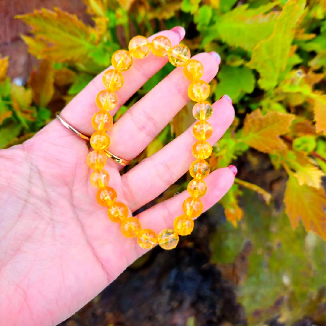 Cada conta da pulseira é cuidadosamente polida para revelar o brilho interno da pedra, criando uma peça que não só é esteticamente agradável, mas também carrega as propriedades energéticas do citrino.