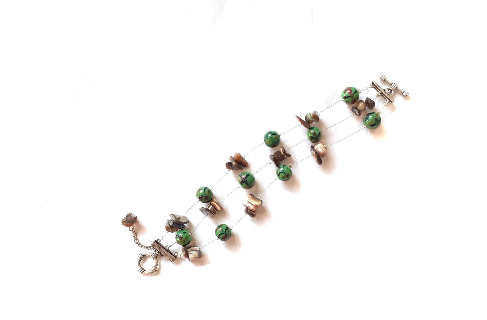 Pulseira com 3 fiadas de conchas naturais com cerca de 22 cm de comprimento.