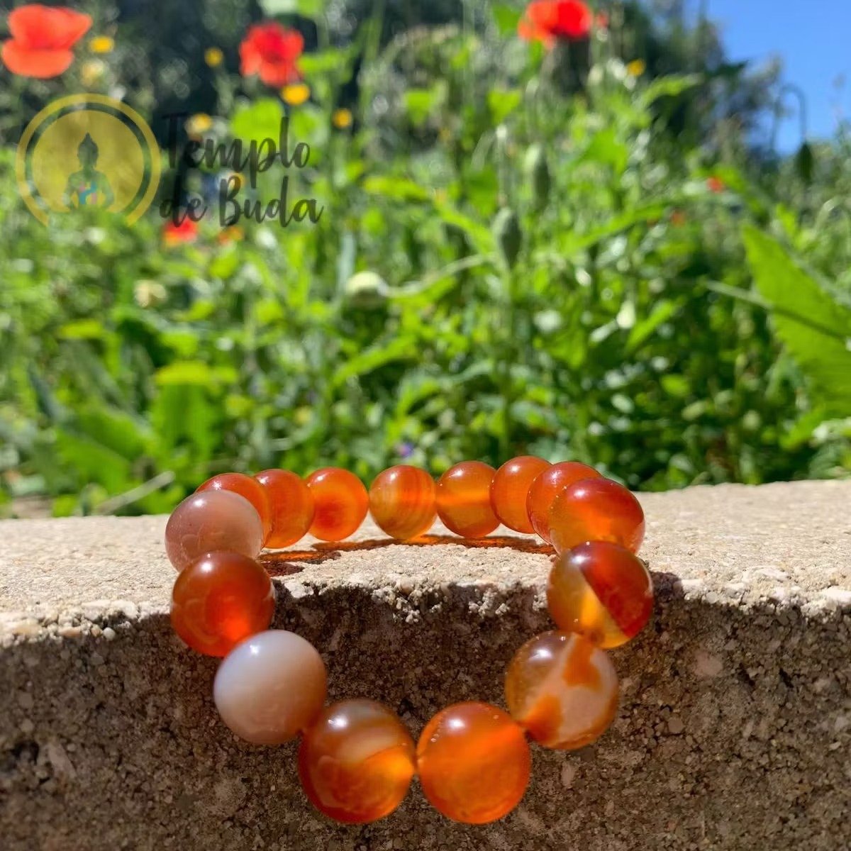 Na forma de pulseira, a Cornalina é trabalhada em contas polidas, revelando a sua translucidez natural e padrões únicos. Cada esfera apresenta variações subtis de cor e intensidade, como se guardasse pequenos fragmentos de fogo no seu interior. A sua forma redonda simboliza continuidade, fluxo e equilíbrio.
