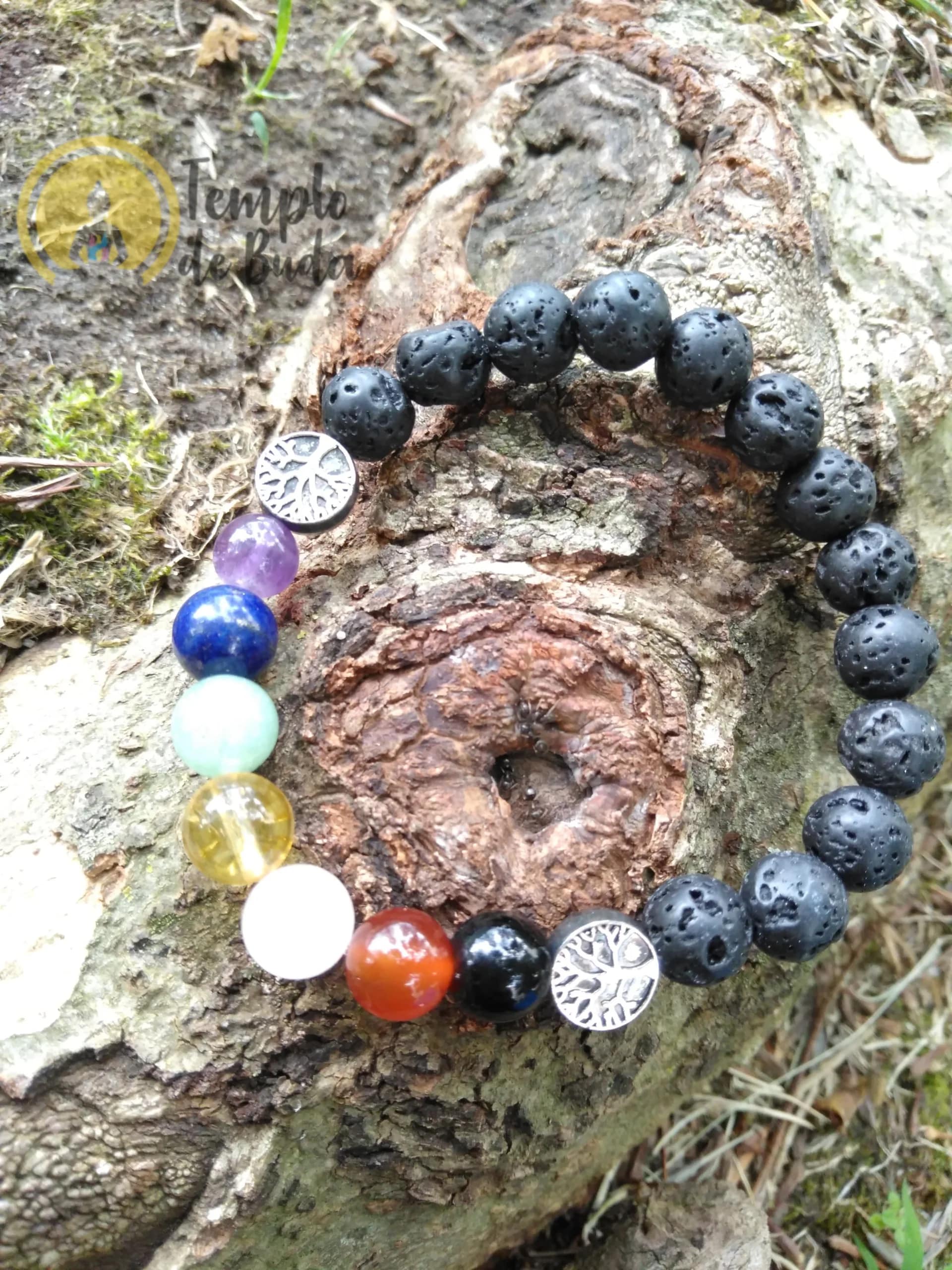 Pulseira de lava ou pedra vulcânica com 14 contas de 8 mm. Possui a árvore da vida, símbolo sagrado da criação, fecundidade e imortalidade. Ela representa a ligação entre céu, terra e submundo. Possui também os cristais relativos aos 7 chakras ( Oníx, Cornalina, Citrino, Quartzo Rosa, Aventurina Verde, Lápiz Lazuli e Ametista)