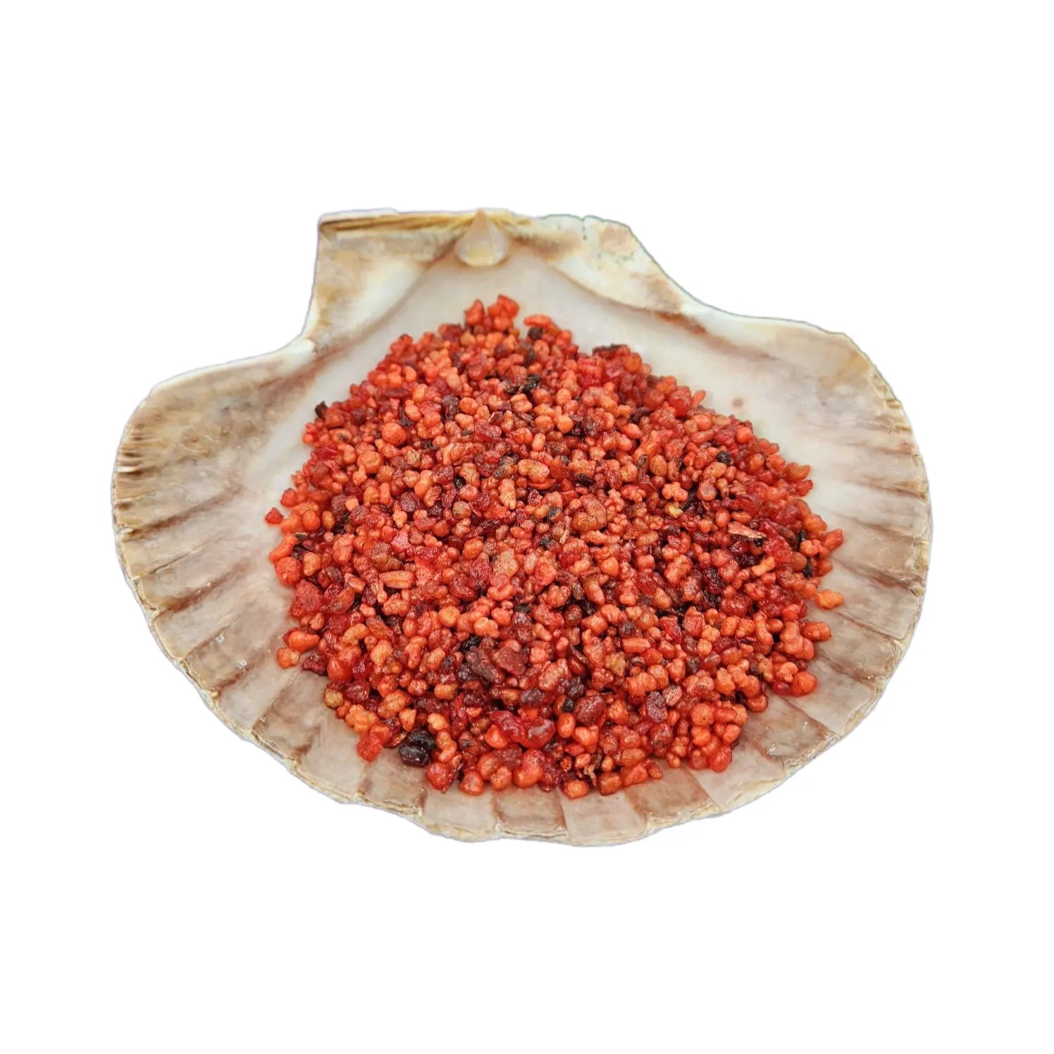 A Resina vermelha nasce das secreções naturais da Boswellia papyrifera, árvore venerada em tradições milenares. Após a extração, a resina é selecionada, refinada em perfumaria e pigmentada com corantes EU-approved. Em forma, ela se apresenta em pequenos grânulos vermelhos translúcidos, com textura resinosa firme e aroma quente, doce e especiado.